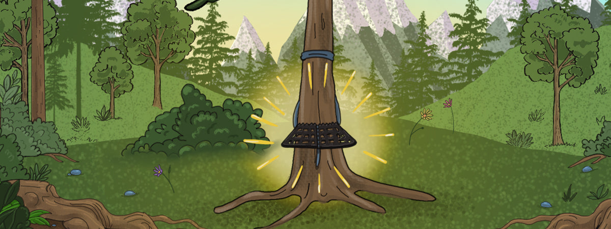 Thread the Red Button Safety Strap through one end of the Double Loop Connector, and wrap around your tree at about shoulder height. Slide the red clip to the locked position after trapping it to the tree.